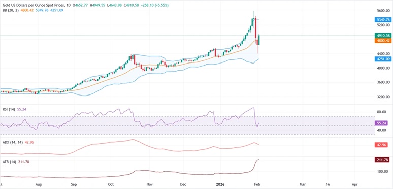 Chaturvedi默示,上行方面,5000好意思元/盎司形式关隘组成金价近期阻力位,紧随后来的是布林带上轨,位于5350好意思元/盎司近邻。下行方面,跌破布林带中轨将使价钱面对4500好意思元/盎司近邻的初步撑握,之后是周一低点4402好意思元/盎司近邻的撑握位。金价更强的撑握位于布林带下轨,约为4250好意思元/盎司。